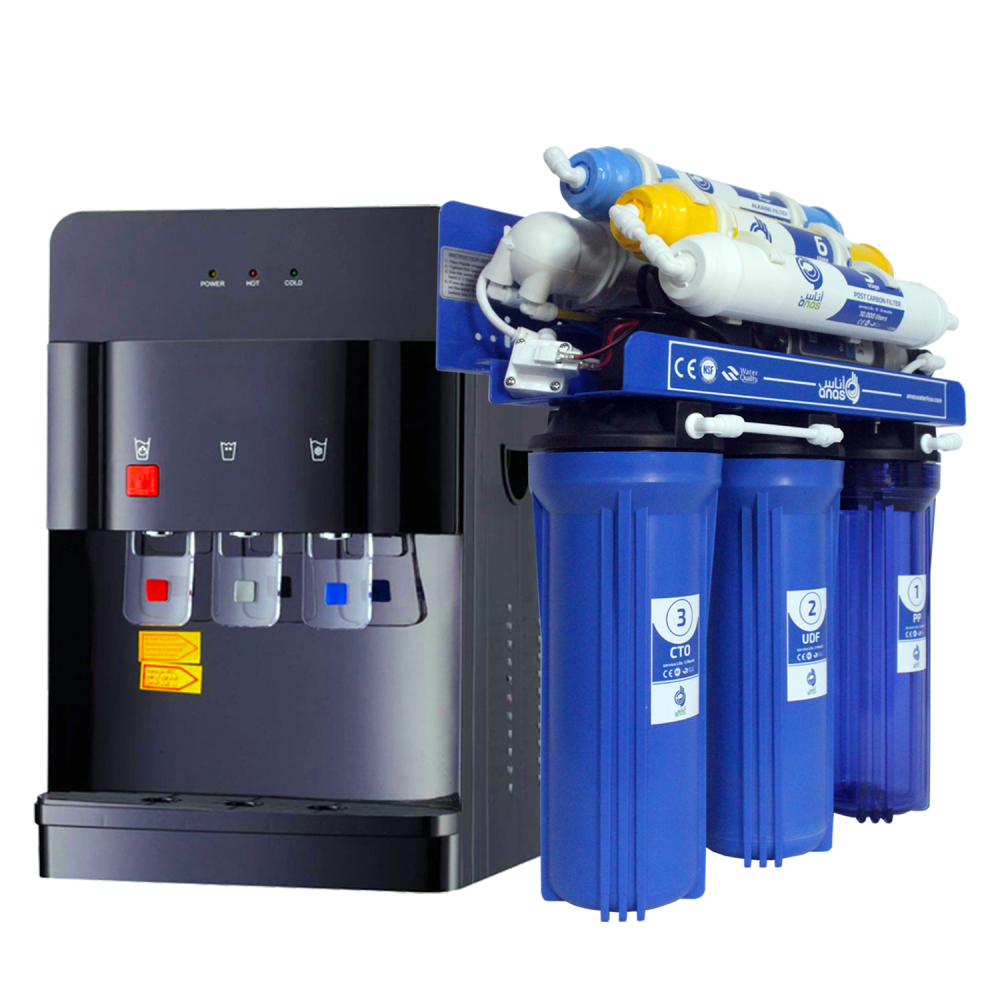 جهاز تحلية مياه مكون من 7 مراحل + برادة 3 صنابير بخزان داخلي تعبئة ذاتية ضمن بكج بسعر واحد